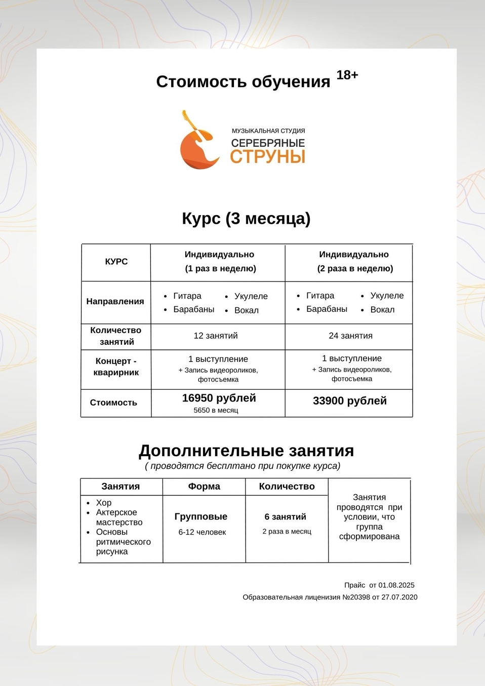 Пропуски занятий: - Пропущенные занятия можно восстановить. - Перерасчет занятий, пропущенных по любой причине (больничный, отпуск и т.д.), не производится.